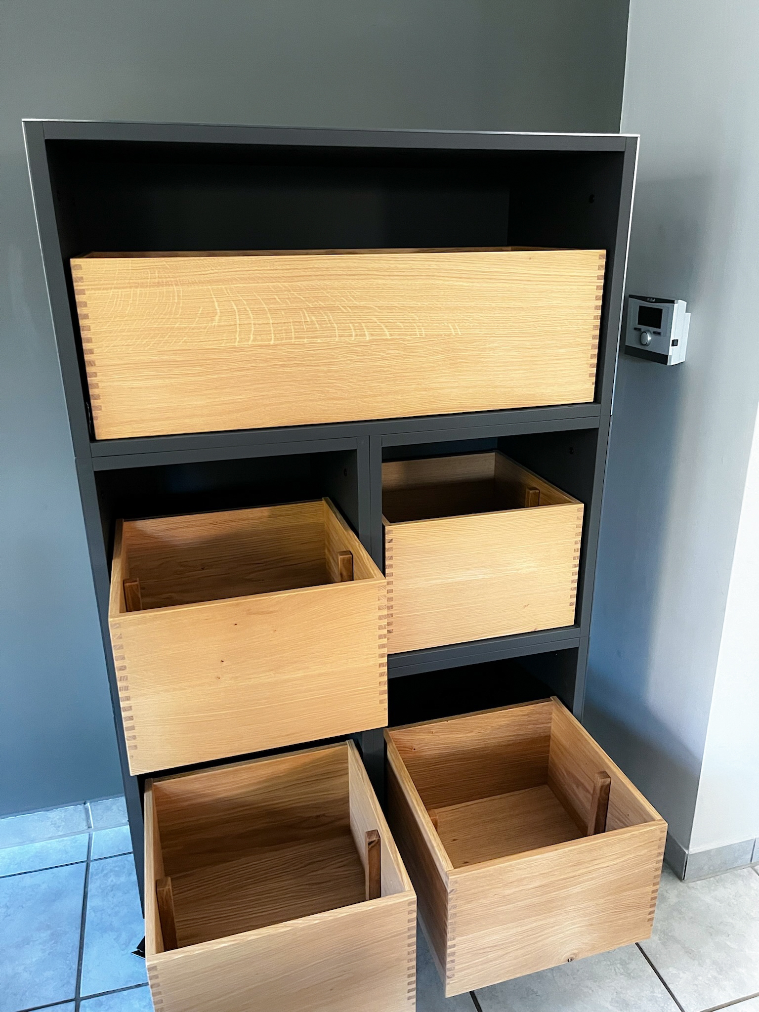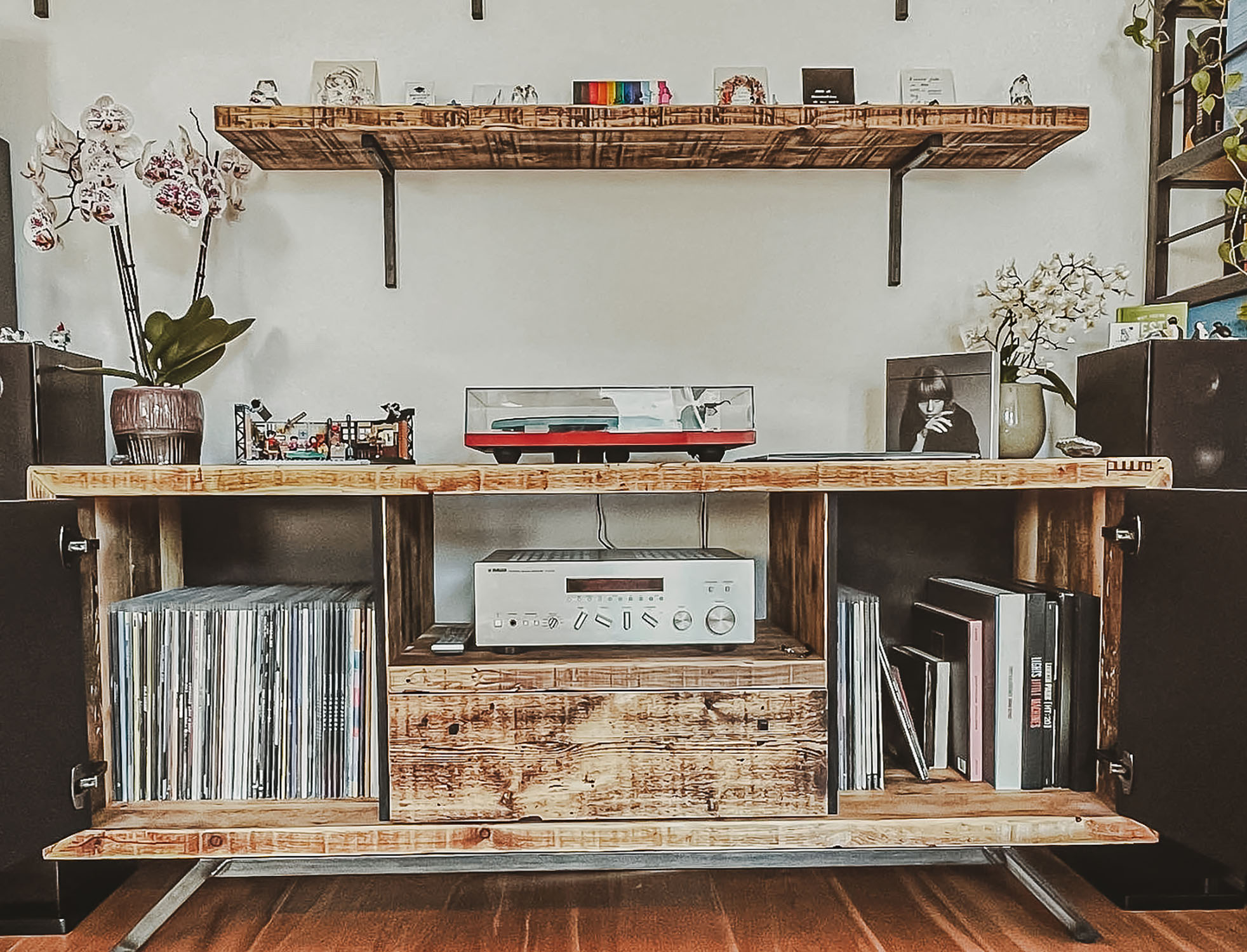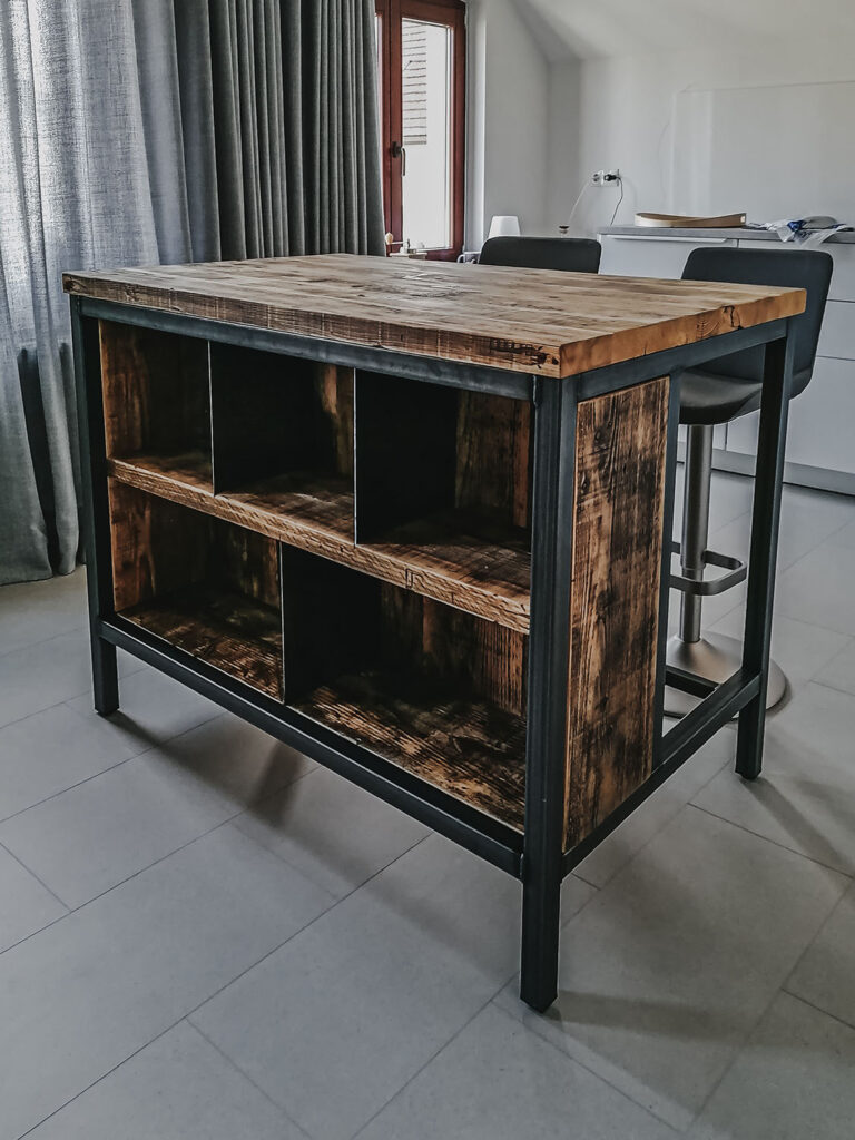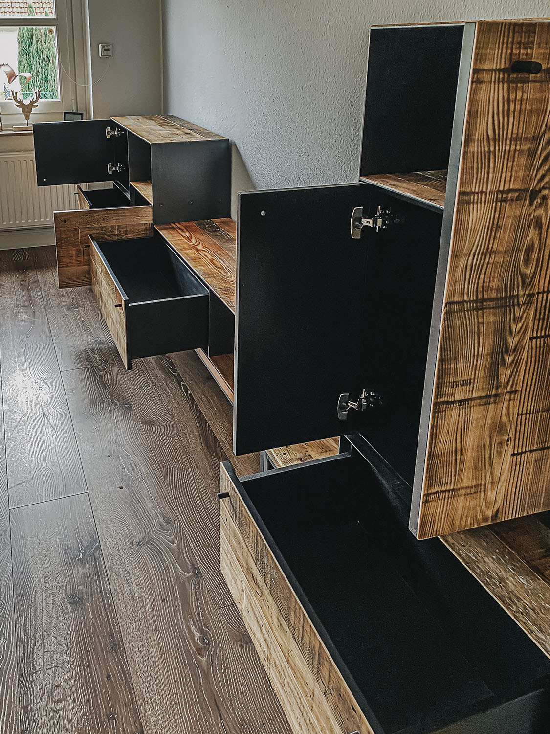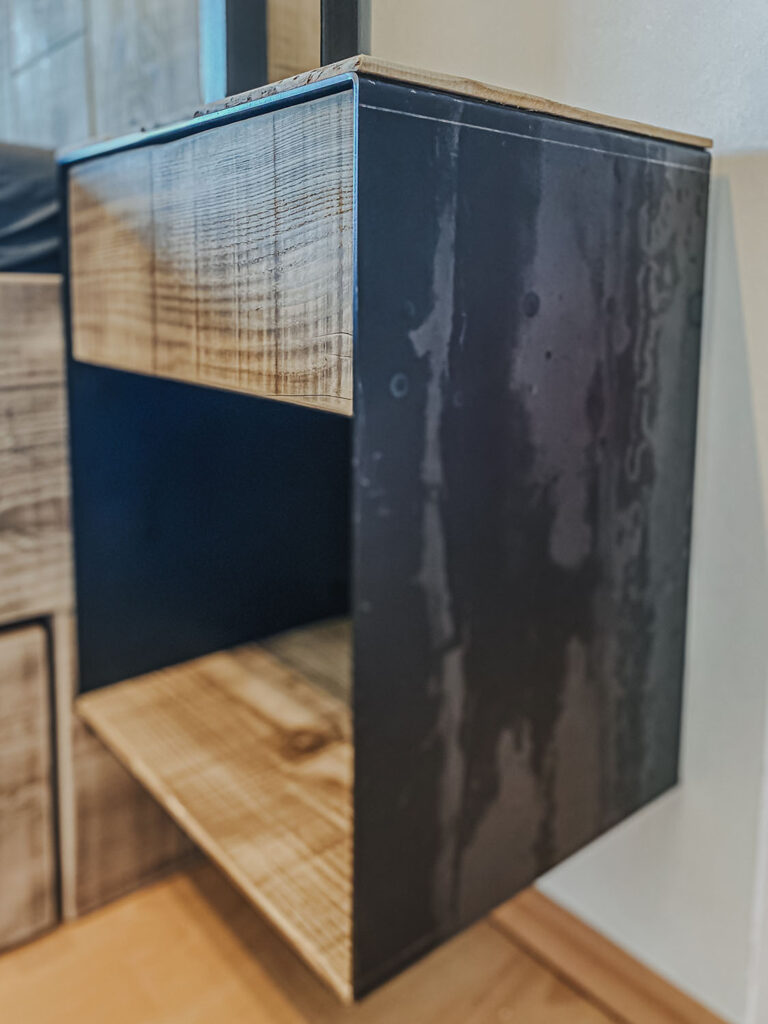 Mit Regalen und Schränken aus Holzbohle und Eiche gut organisiert.