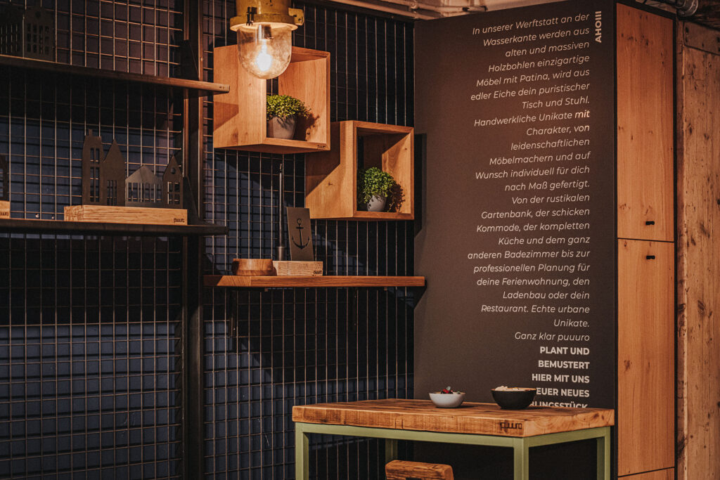 Direkt am Oldenburger Hafen, mitten im alten Werftgelände und an der Wasserkante, in einer Werkstatt, in der das Handwerk seit urlanger Zeit zuhause ist, bauen wir deine Möbel. Deshalb nennen wir unsere Möbelwerkstatt „Werftstatt“. Der besondere Charme dieses Ortes spiegelt sich in unserem Design wider und steht sinnbildlich für Ursprünglichkeit, für Geschichte, für das Handwerk in Oldenburg. Das Arbeiten an der Wasserkante inspiriert uns. Von der Natur geprägte Oberflächen, Texturen und Farben. Und während wir deine Möbel bauen oder an deinem Projekt feilen, weht uns die Hafenluft um die Nase. Immer eine frische Brise für neue Ideen, für pure Unikate.
